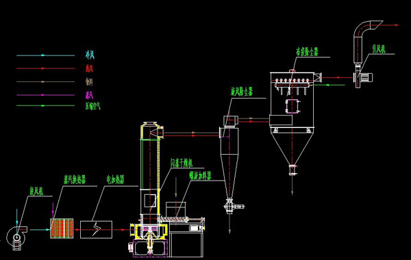 熱空(kōng)氣由進風口以适宜的噴動速度從幹燥機底部進入攪拌粉碎幹燥室,對物料強烈的剪切、吹浮、旋轉作(zuò)用,于是物料受到離心、剪切、碰撞、磨擦而被微粒化,強化了傳質傳熱。在幹燥機底部,較大(dà)較濕顆粒團在攪拌器(qì)的作(zuò)用下被機械破碎,濕含量較低(dī)、顆粒度較小(xiǎo)的顆粒被旋轉氣流夾帶上(shàng)升,在上(shàng)升的過程中進一步幹燥,由于氣固相作(zuò)旋轉流動,固相慣性大(dà)于氣相,固氣兩相間(jiān)的相對速度較大(dà),強化兩相間(jiān)的傳熱效果,所以該機幹燥強度高(gāo)。