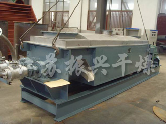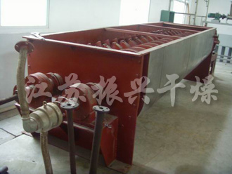 在漿葉及夾套通(tōng)入蒸汽加熱的同時(shí),出料口上(shàng)部同時(shí)通(tōng)入經過加熱後的幹空(kōng)氣進一步幹燥,這樣大(dà)大(dà)增加了設備的幹燥強度。蒸發出來(lái)的水(shuǐ)分由尾氣帶出幹燥機,經過布袋除塵器(qì)過濾,将幹燥後的細粉回收下來(lái),濕空(kōng)氣由水(shuǐ)除塵後引風機排出室外。