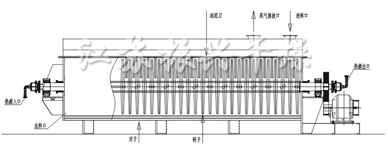 (1) . 設備結構緊湊,污泥烘幹機裝置占地面積小(xiǎo)。幹燥所需熱量主要是由排列于空(kōng) 心軸上(shàng)的空(kōng)心葉片壁面提供,而夾套壁面的傳熱量隻占少(shǎo)部分。所以單 位體(tǐ)積設備的傳熱面大(dà),可(kě)節省設備占地面積,減少(shǎo)基建投資。