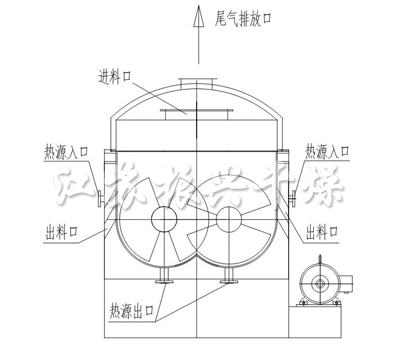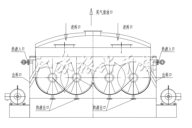 空(kōng)心軸上(shàng)密集排列着空(kōng)心葉片,熱介質經空(kōng)心軸流經葉片。單位有(yǒu)效容積 內(nèi)傳熱面積很(hěn)大(dà)(一般單台雙軸槳葉面積≤ 200m2 左右;單台四軸槳葉面積 ≤ 400m2 左右),熱介質溫度從60~320℃,可(kě)以是水(shuǐ)蒸氣,也可(kě)以是液體(tǐ)型: 如熱水(shuǐ)、導熱油等。間(jiān)接傳導加熱,熱量均用來(lái)加熱物料,熱量損失僅為(wèi)通(tōng) 過器(qì)體(tǐ)保溫層和(hé)排濕向環境散熱。